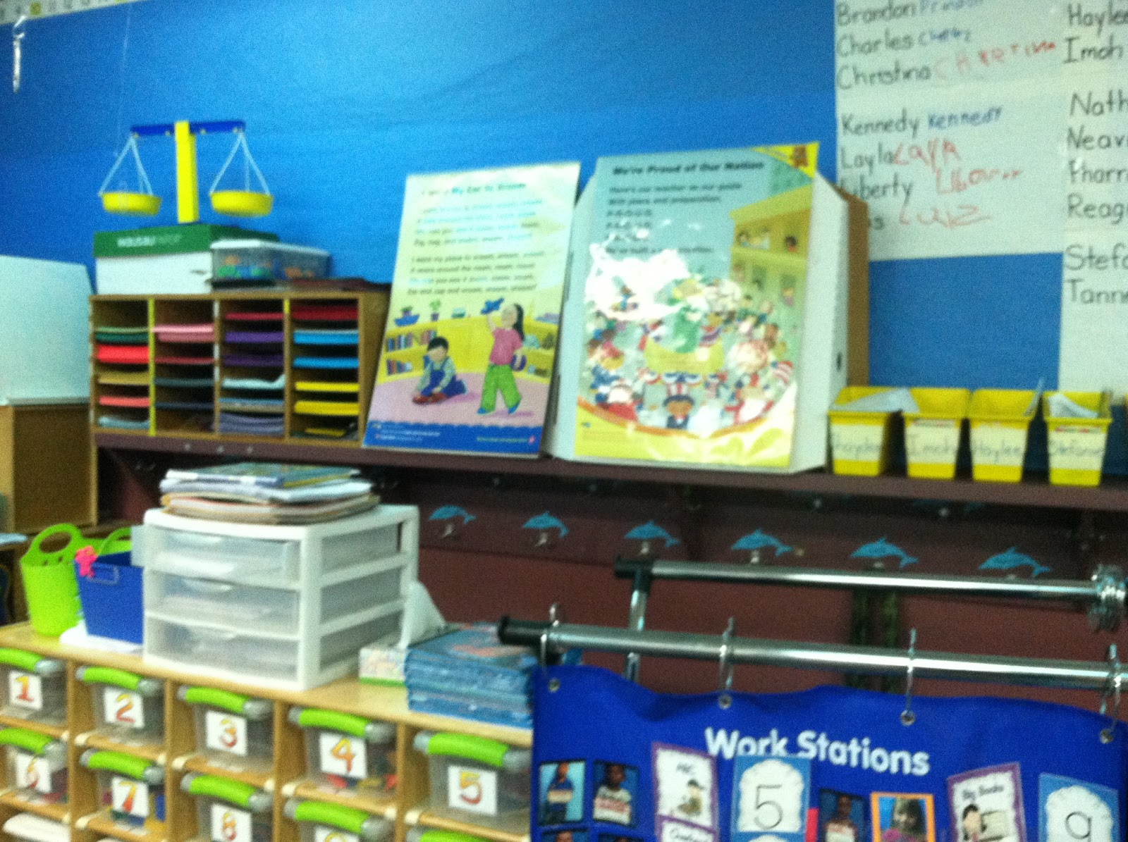 Thank you for sharing your classroom! I gained some awesome ideas too! I need to find a better way to organize which math station my kids go to and I think the pocket chart idea would be great. I just need to figure out where to put it. I like that their pictures are used with that too!